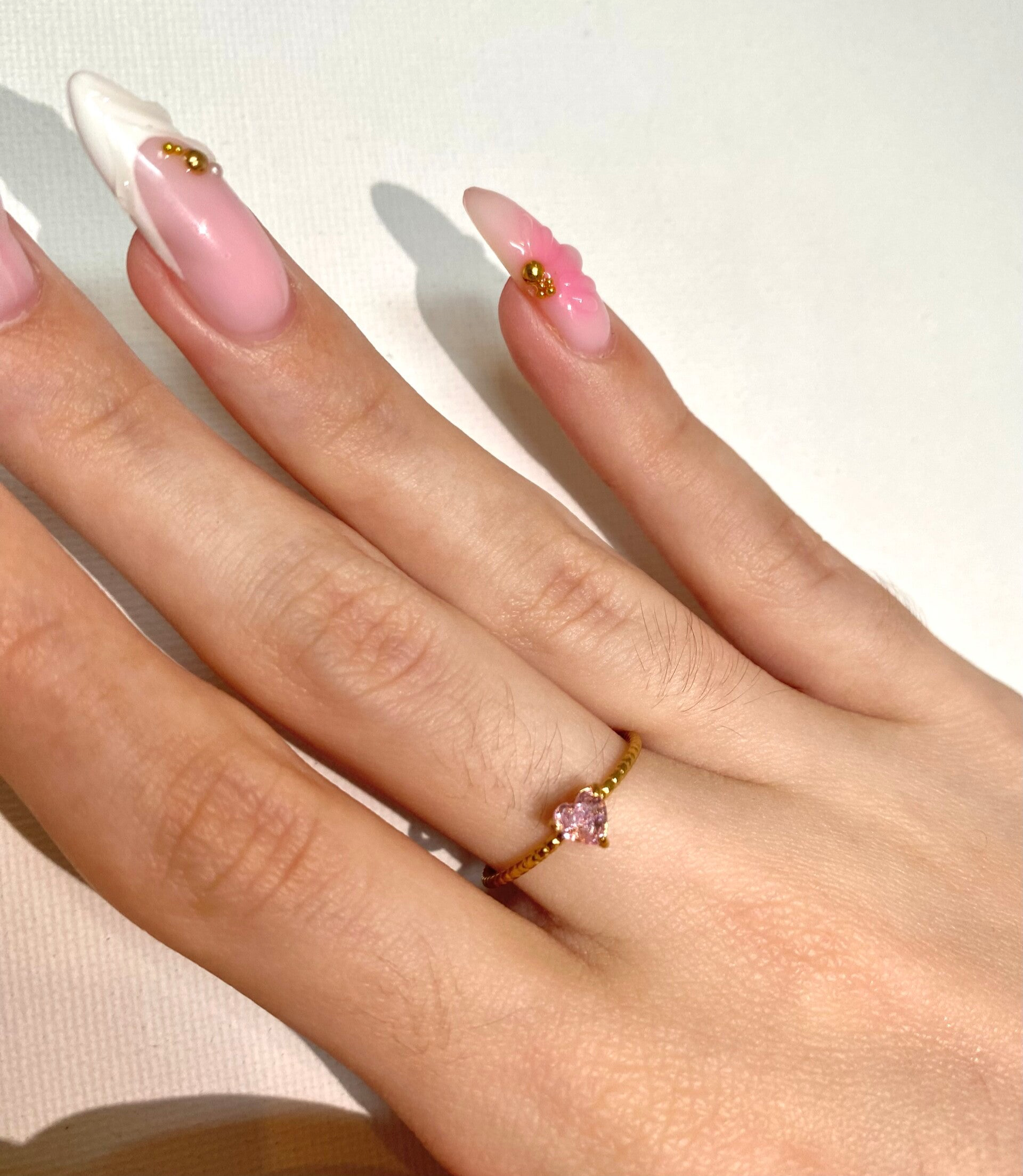 Bague ornée d'un petit cœur en zirconium rose, légère, éclat subtile et cadeau doux...